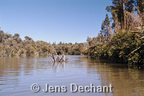 Heute war wieder sehr schönes Wetter. Wir erkundeten kurz die nähere Umgebung vom Zelt. Die südalpen spiegelten sich im Wasser der Okarito Lagune, die ohne Wellen vor uns lag. Nach dem Zeltabbau kreuzten wir noch lange auf der Lagune. Auch das Delta des Okarito River erkundeten wir noch einmal. Diesmal fuhren wir in einen anderen Arm ein. Nachmittags nahm der Wind etwas zu. Leider Gegenwind. Wellen schlugen ans Kajak und das Wasser spritzte uns in die Gesichter. Gegen 16 Uhr kamen wir am Steg vor Okarito an.